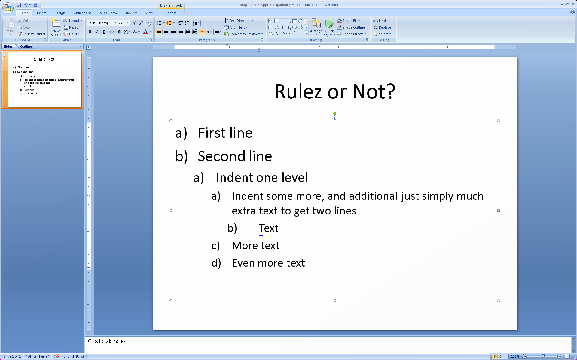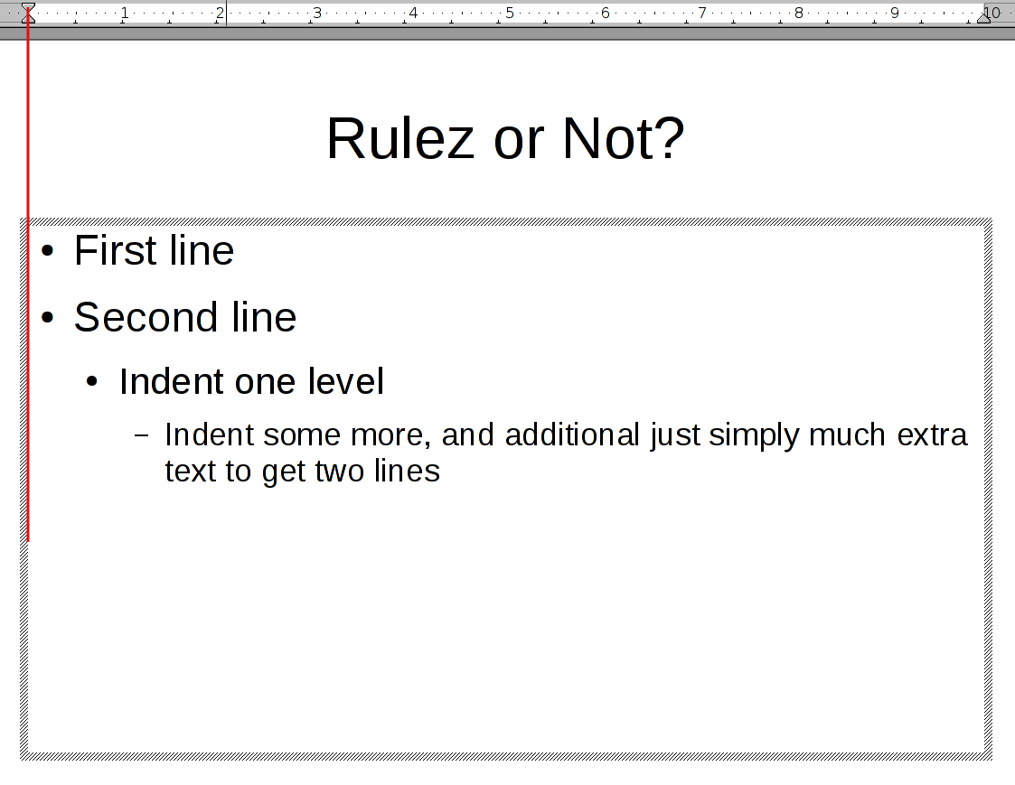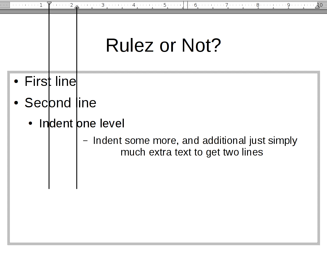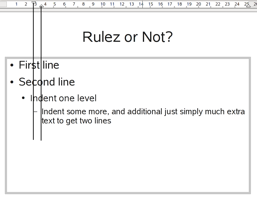 Somewhat different – changing outline attributes don’t affect numbering. I initially thought a bit about the indentation issue, as you can find arguments for both ways; ultimately though, deviating from MSO for no extremely good reason is something we usually avoid in OOo-land; and incidentally there’s a good reason for the way PowerPoint is doing it: indentation, font, coloring, numbering scheme, etc. is just formatting. The only thing I would consider content is the outline level, i.e. the depth of the nesting (of the numbered paragraphs), on the document level.
