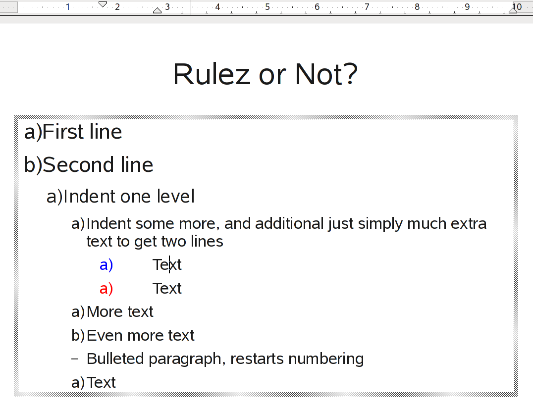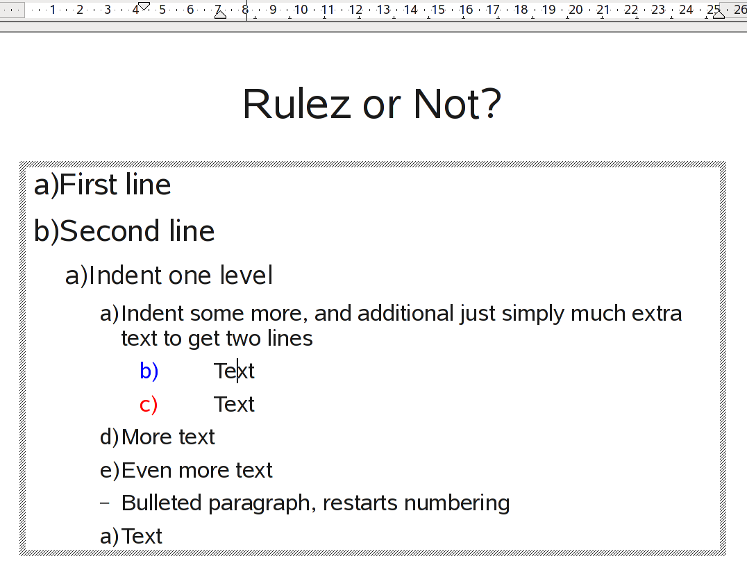 That is, changing any attribute, even the color of the number, restarts numbering in Impress (notice the double occurence of the colored "a)"). While when changing indentation, this might be acceptable, the behaviour with color is clearly non-intuitive, and also likely a fall-out of the list level fixes. Let’s look at the competition: