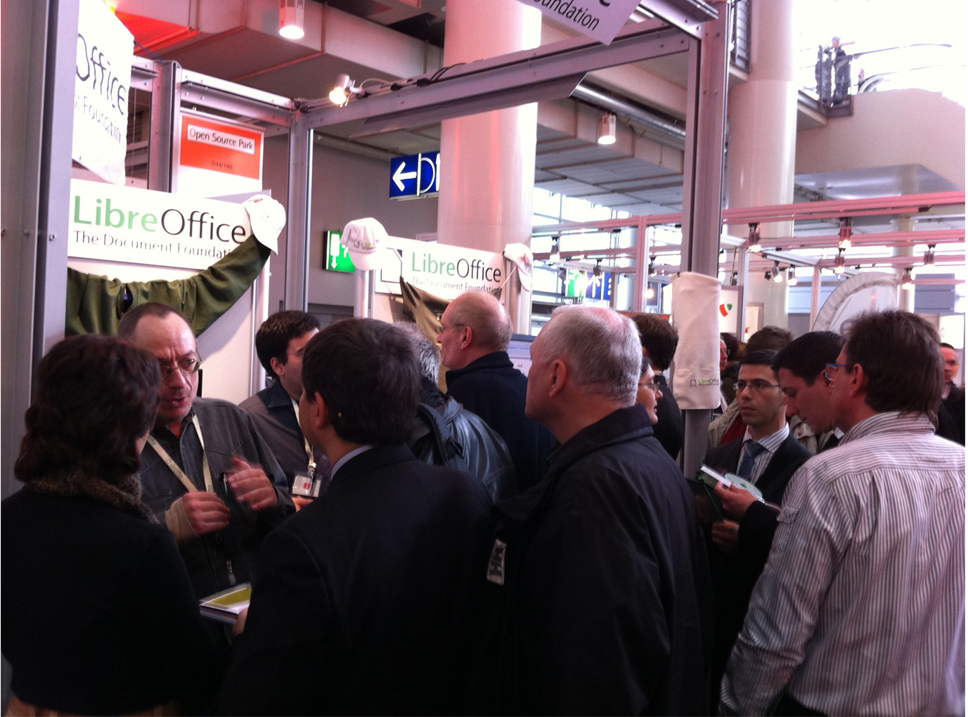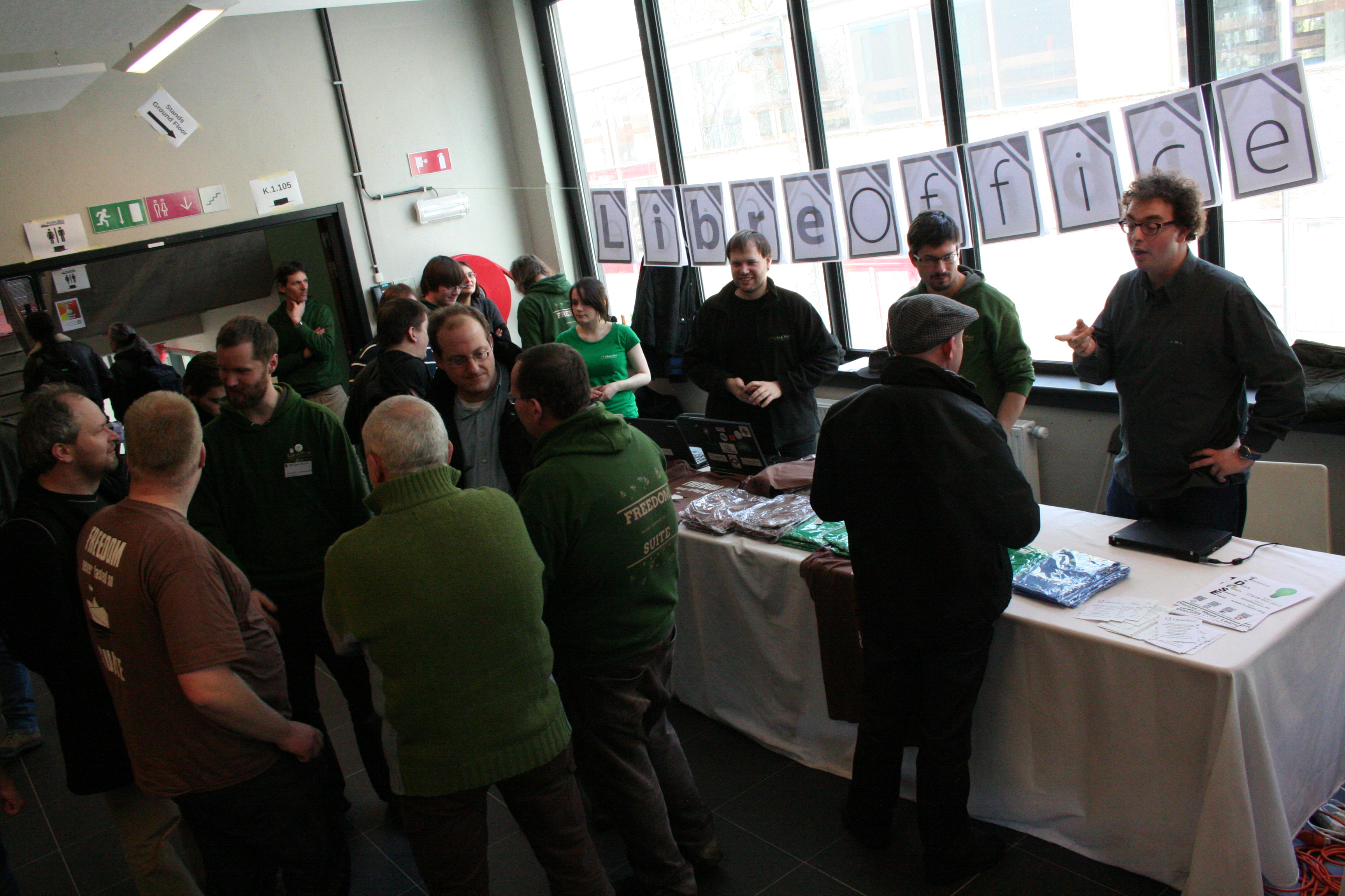Although both events are almost diametrally different, in both audience and recommended attire, there was a common trait – the interest and support we received for LibreOffice was immense. On FOSDEM, we had a table right between CACert and FSFE, in the entrance area of building H (one of the best places, I gather). Kendy and Bubli had brought boatloads of LibreOffice tshirts and jumpers from Prague, that we collectively lugged to the booth & almost fully sold over the weekend. Lots of people wearing green, suddenly.
